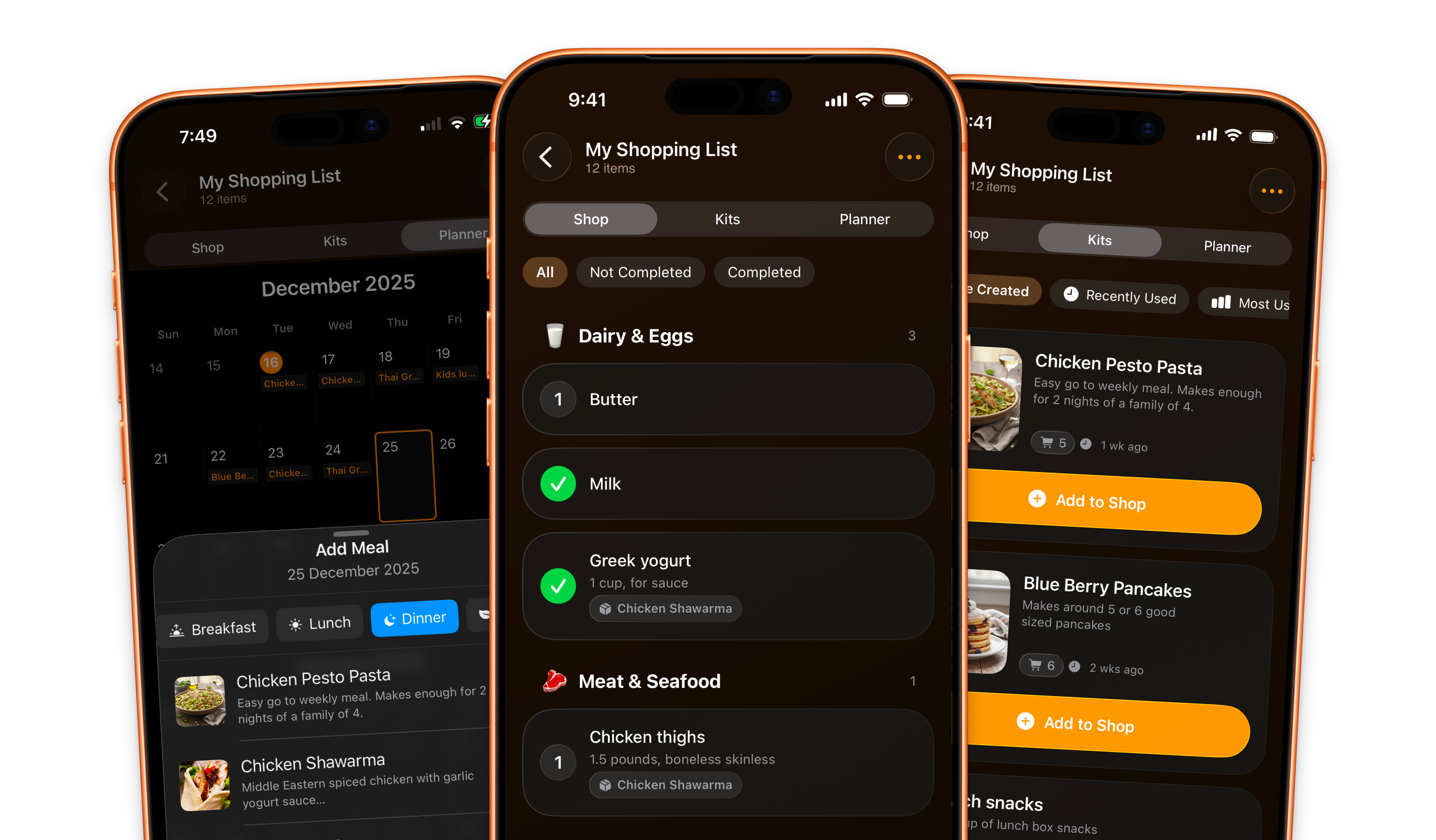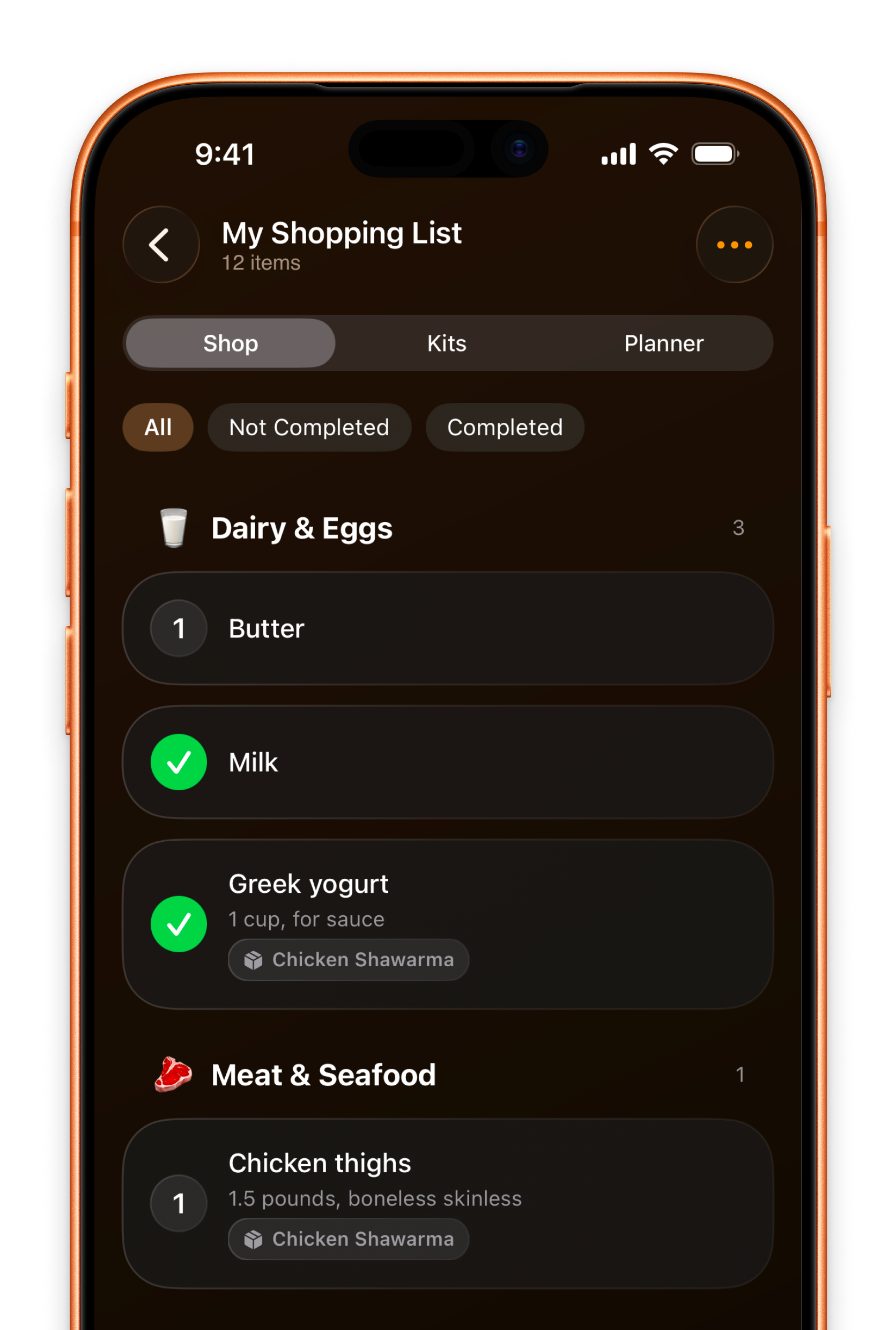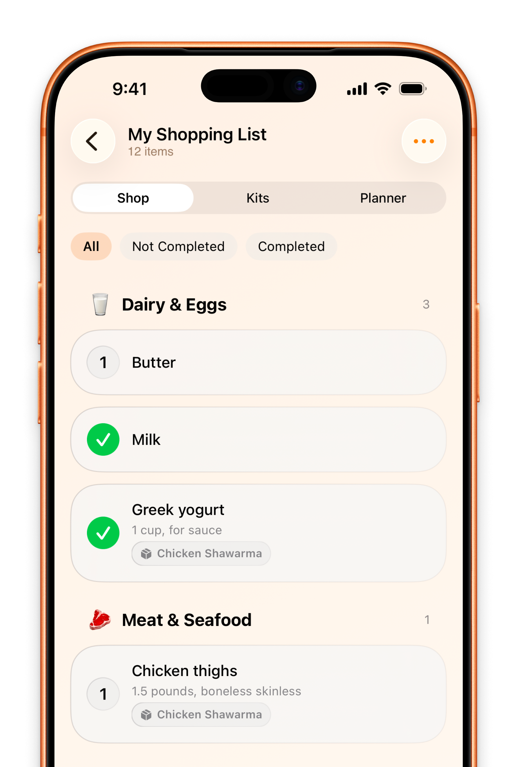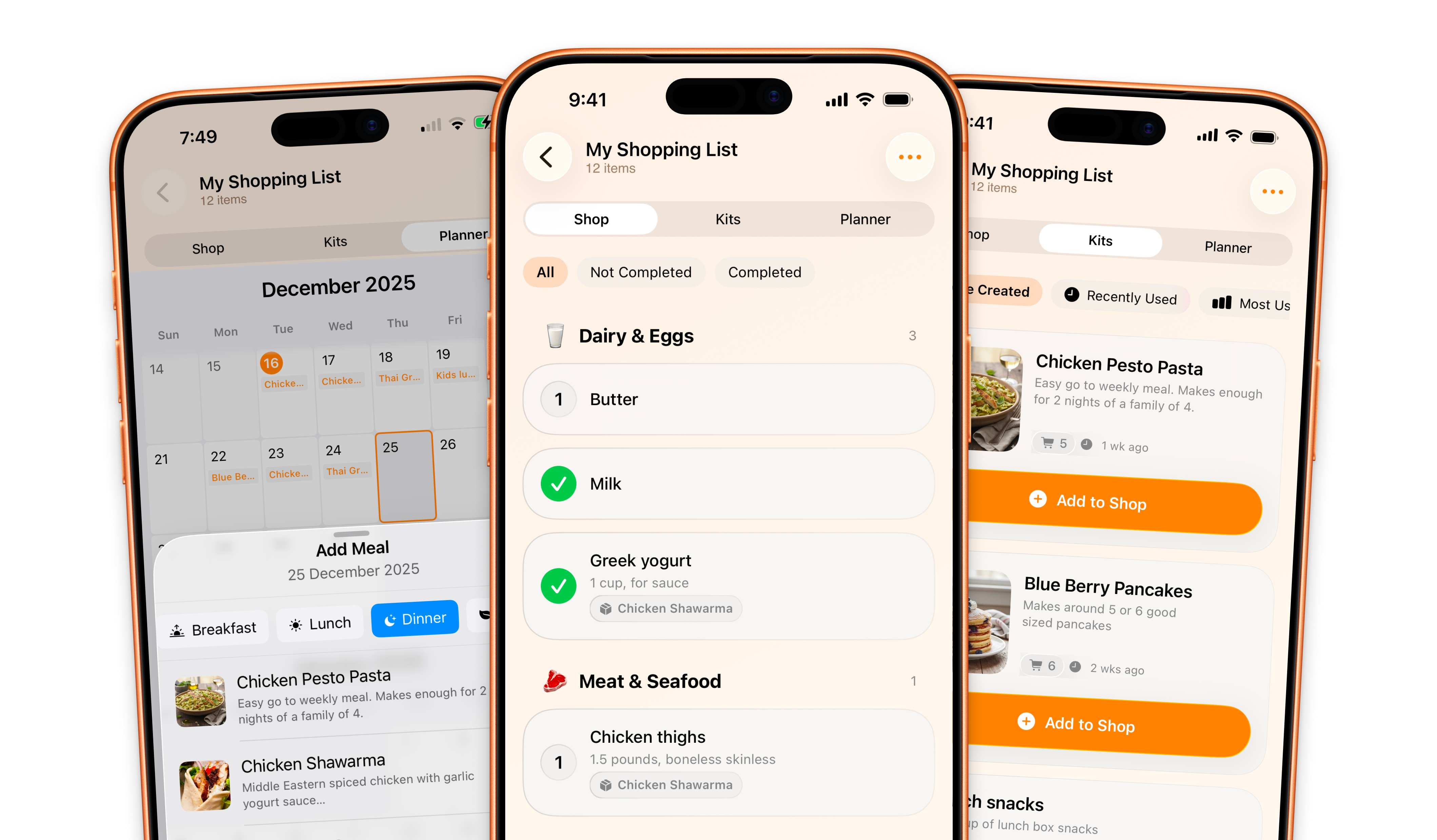 Set and forget your favourites, from meals, to those weekly purchases. Kits build your shopping list instantly.